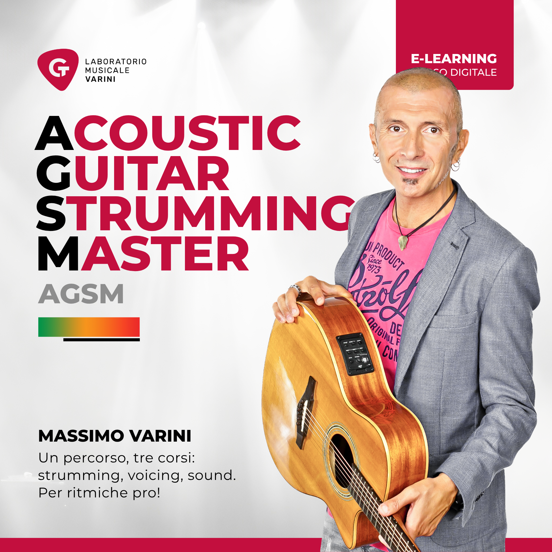 Il percorso si articola in tre corsi da seguire in sequenza. Il primo — Acoustic Guitar Strumming — parte dal movimento della pennata e costruisce progressivamente groove sempre più complessi, con accenti, parzializzazioni, muting, percussione e tecniche con le dita. Il secondo — Acoustic Guitar Voicing — entra nel mondo degli accordi: struttura, estensioni, CAGED, corde a vuoto e accordature speciali. Il terzo — Acoustic Guitar Sound — affronta tutto ciò che riguarda il suono: plettri, amplificazione live, ripresa microfonica, registrazione e mixaggio. Tre mondi distinti che insieme formano una visione completa della chitarra acustica.