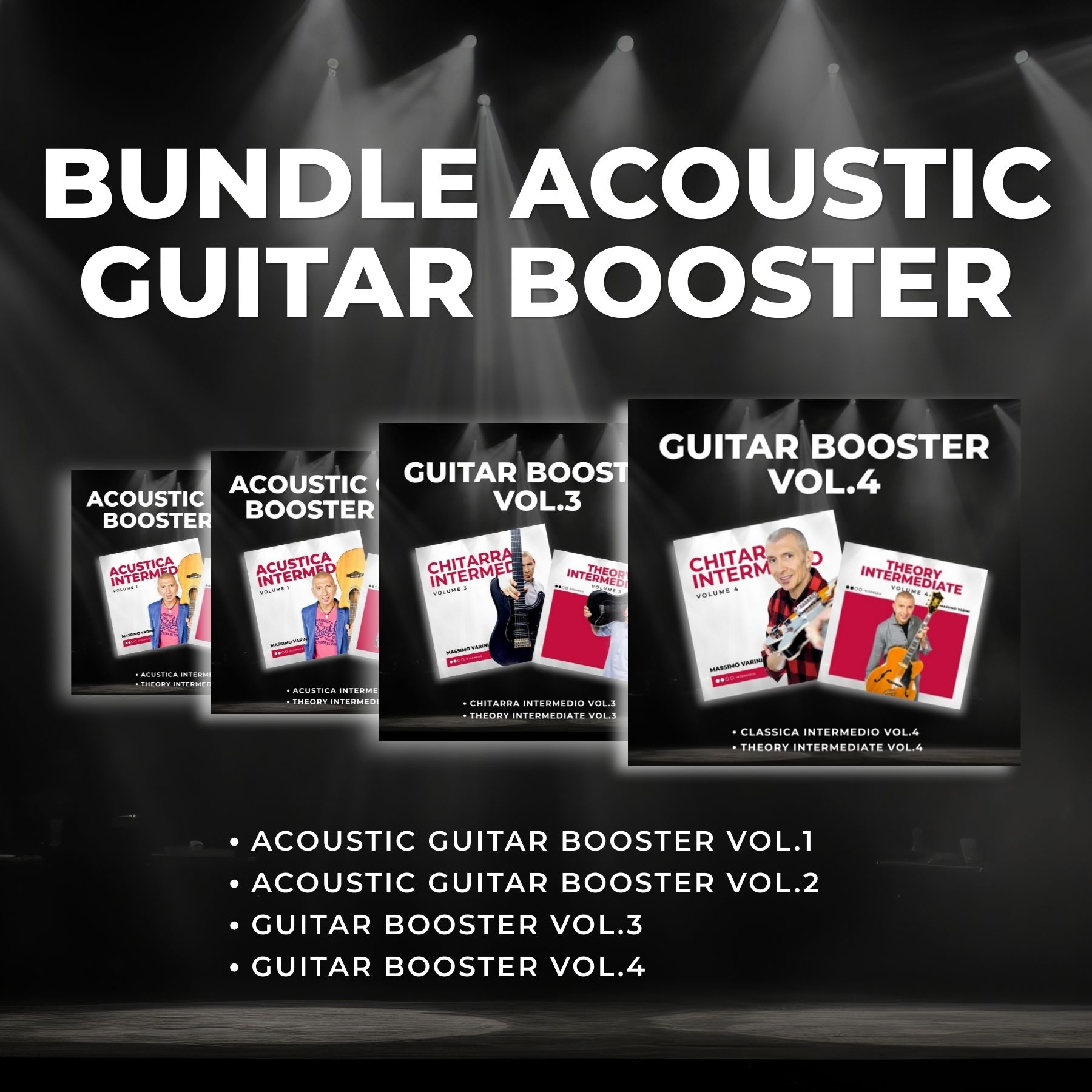 - Acoustic Guitar Booster Vol. 1 — Il salto di qualità: scale su tutta la tastiera, armonia funzionale, arpeggi avanzati e pattern ritmici più sofisticati.