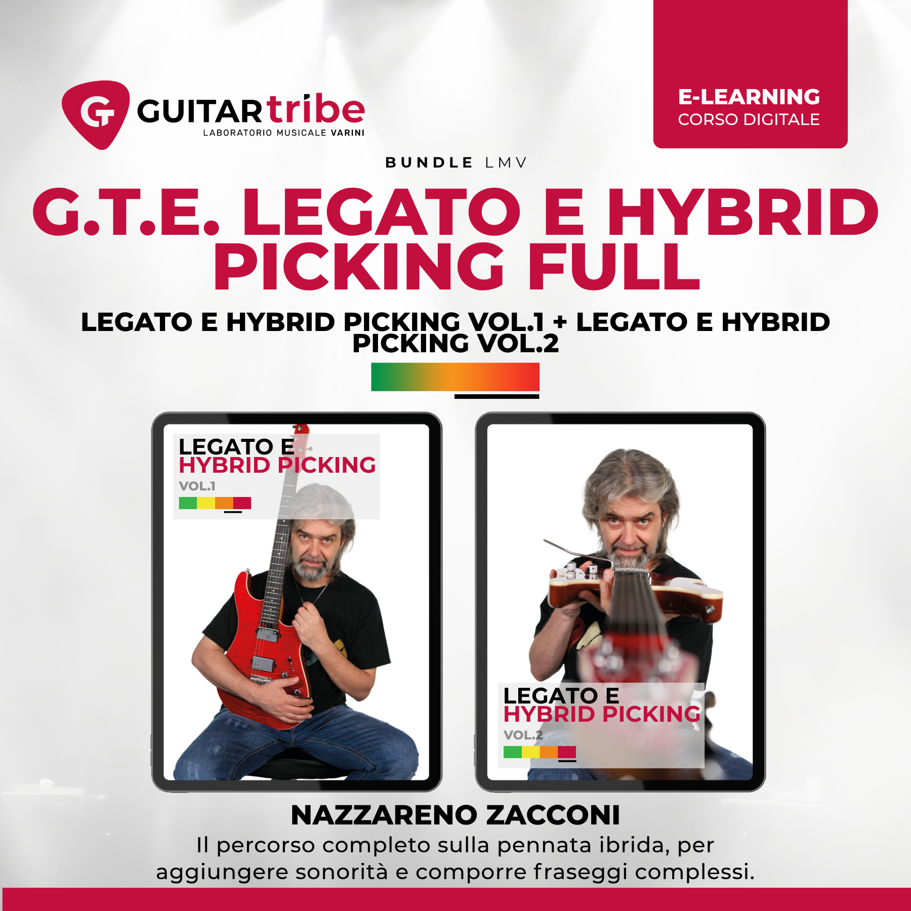 Vol.1 costruisce le fondamenta in modo sistematico: esercizi preliminari per la mano sinistra, sviluppo progressivo del legato su pentatonica, scala maggiore melodica e minore armonica, pattern su cellule melodiche in terzine e quartine con sviluppo sia verticale che diagonale, arpeggi con sweep e hybrid picking e string skipping conclusivo. Vol.2 riprende da lì e porta ogni elemento verso il livello successivo: consolidamento delle basi, pattern sempre più complessi, aumento di velocità e precisione, e focus sull’integrazione fluida tra le due tecniche in frasi musicali complete. La continuità è quella della serie GTE — Vol.2 è il prerequisito diretto di Vol.1, e presuppone la padronanza completa di quanto sviluppato nel primo volume.